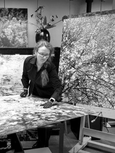 Natuur vormt het centrale uitgangspunt in haar oeuvre. Bloemen, planten, takken en organische structuren keren steeds terug, niet als botanische weergave maar als dragers van verstilling en gelaagdheid. In haar bloemwerken lijken vormen te versmelten met hun omgeving, alsof ze zich langzaam oplossen in licht en materie. De bijenwas geeft haar schilderijen een warme huid, een subtiele glans en een tastbare diepte, waardoor het oppervlak bijna lijkt te ademen.